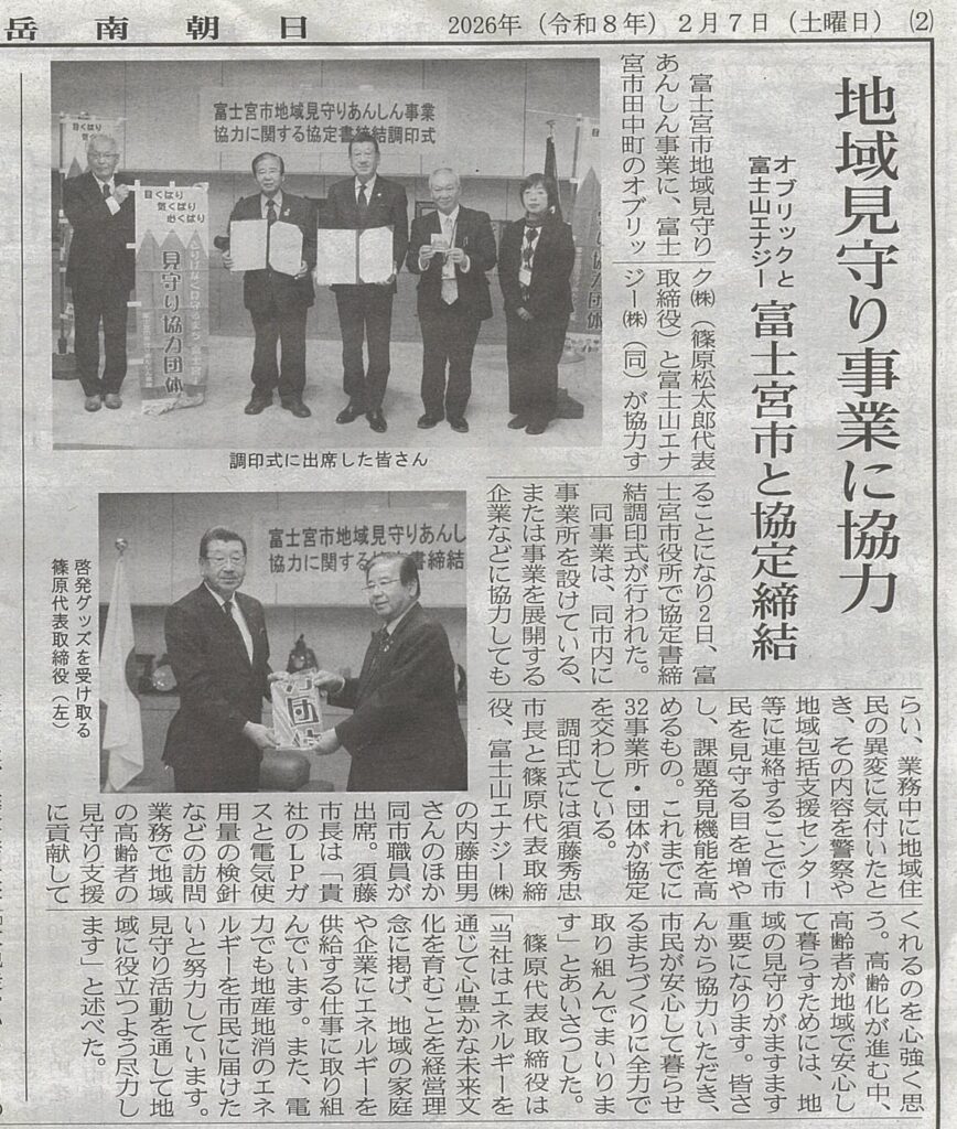 この度、富士山エナジー株式会社は『富士宮市地域見守りあんしん事業協力団体』に登録されました。